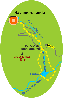 Desde el pueblo, el recorrido gana altura hasta alcanzar un collado desde donde parten las vertientes del arroyo del Lugar hacia el norte y por el que hemos subido, y del Cachizo hacia el sur, por el cual se continúa hasta llegar al embalse del Guadyerbas, la primera represa que se encuentran las aguas serranas este cauce en su camino hacia el río Tiétar.